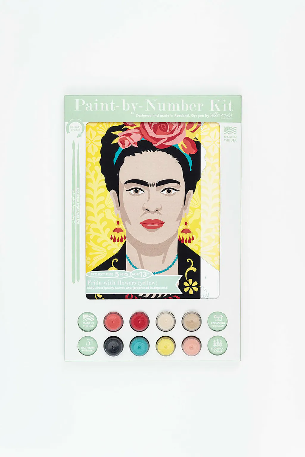 The Frida with Flowers (yellow background) paint-by-number kitdepicts a portrait of the beautiful Mexican artist Frida Kahlo with roses in her hair. The pre-printed background features Mexican folk art design. Completing the acrylic painting can take between 3-5 hours. When completed, select a frame at your local craft store and display your new handmade home decor! This DIY craft is recommended for adults and teens age 13 and up.